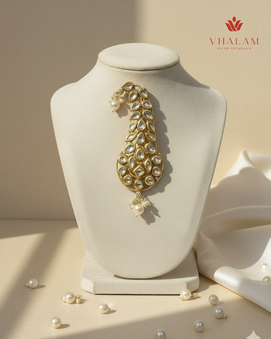 Channel timeless elegance with this Paisley Kundan Turban Brooch, a true mark of royalty and refined craftsmanship. Featuring a stunning array of marquise and round-cut kundan stones set in a golden framework with a soft green enamel touch, this brooch radiates grandeur. The delicate pearl hangings at both ends add a subtle charm, making it a perfect statement piece for the groom’s safa or sherwani.