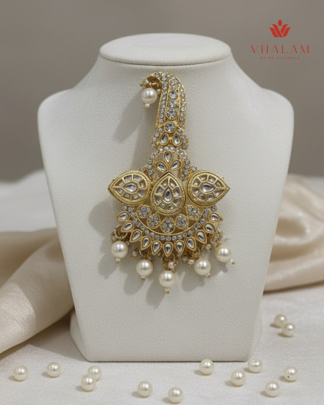 Crafted from a high-quality alloy base, featuring kundan stones, crystal embellishments, and pearl beads, finished with a radiant gold plating for a luxurious and enduring shine.